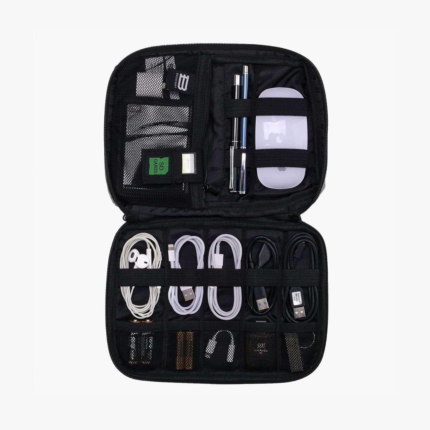Featuring 5 elastic loops (S), 2 elastic loops (L), 1 mesh zippered pocket, 5 elasticized mesh segments, and a pocket for chargers, USB drives, and more, keep your accessories untangled and easily accessible.